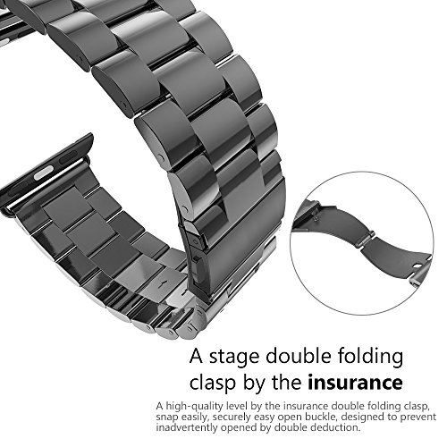 [ln] TOP QUALITY: The strap is designed for 38mm apple watches, consists of 52 pieces of premium 316L stainless steel alloy with custom lock closure, polished by a number of processes and colored by vacuum plating. Hence it is more wear and corrosion-resisting, and will never get rusty. [ln] [ln]- [ln] SAFE AND COMFORTABLE: 1. Having a two button press to unlock also stops accidental bumps knocking it of. 2. Compared to rubber strap, stainless steel watch strap has better breathability and prevents you from allergy. 3. It feels nice on the skin, never cause your hand to sweat. [ln] [ln]