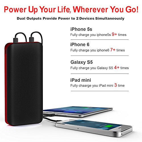 [ln] 1. Ultra high capacity: 25000mAh, charge iPhone 6 for 7.3 times, iPhone 5s for 9.2 times, iPad mini for 3 times, Galaxy s5 for 4.7 times, ideal for outdoor holiday business hiking sport activity. [ln] [ln]- [ln] 2. Dual outputs: provide power to 2 devices simultaneously,2.1A USB port for iPad/Tablets, 1A USB ports for iPhone, android phone and other smart phones or other electronic devices, which is convenient for your friend or family charging at the same time. [ln] [ln]